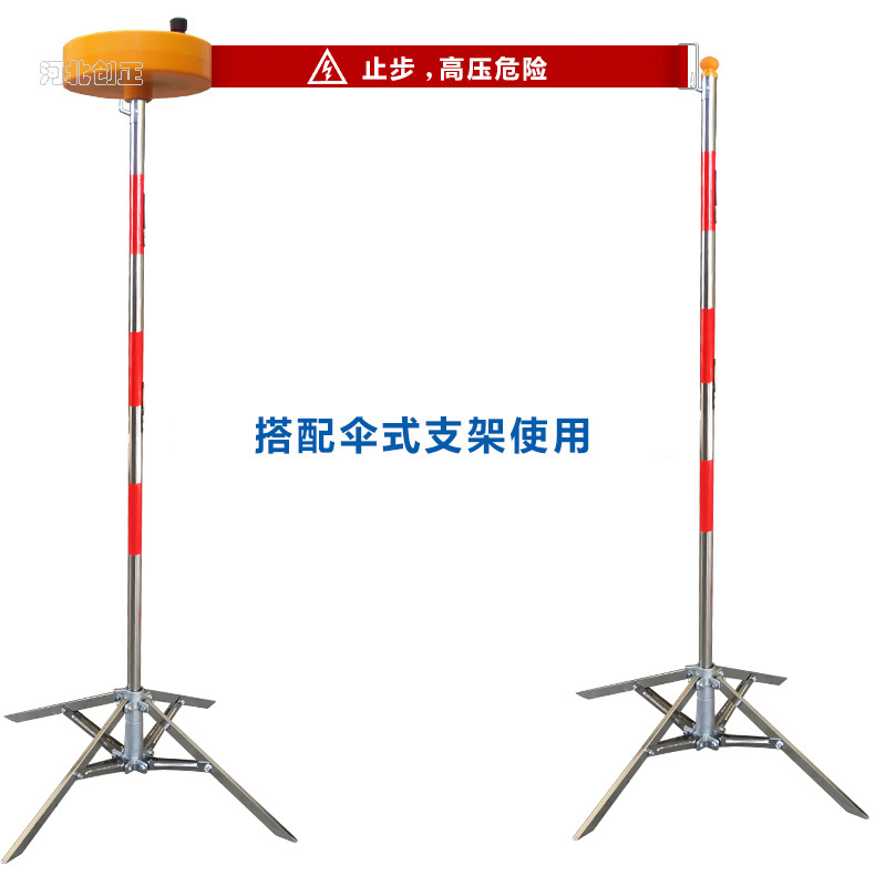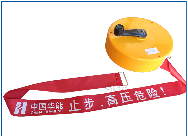 警示帶盒是ABS材料制成;帶是錦綸材質,上面印有“閃電符號,止步,高壓危險”等字樣。