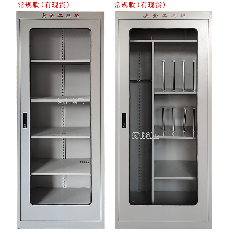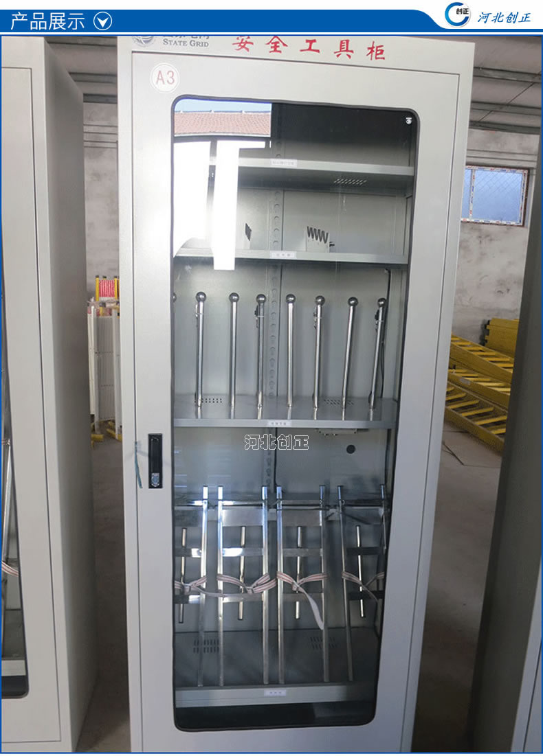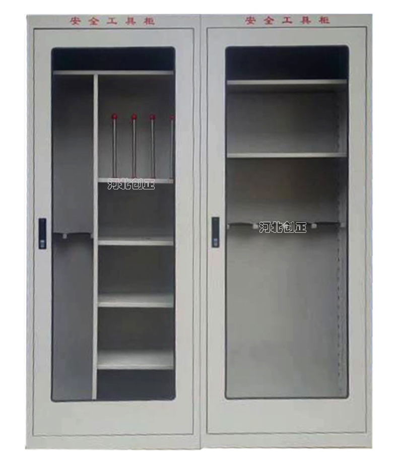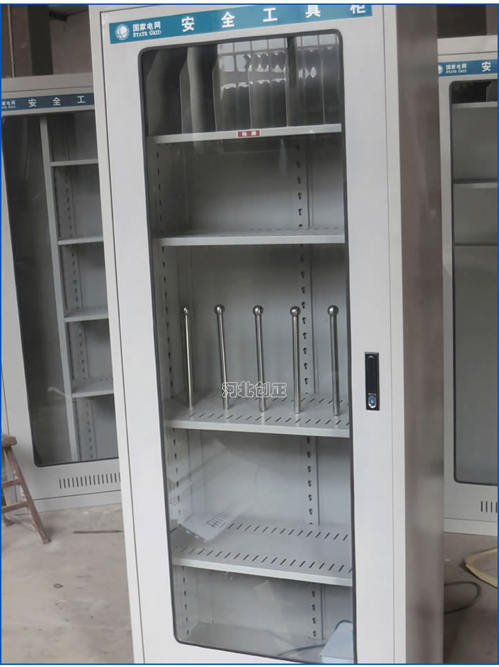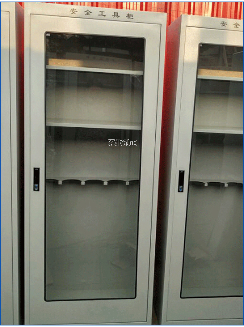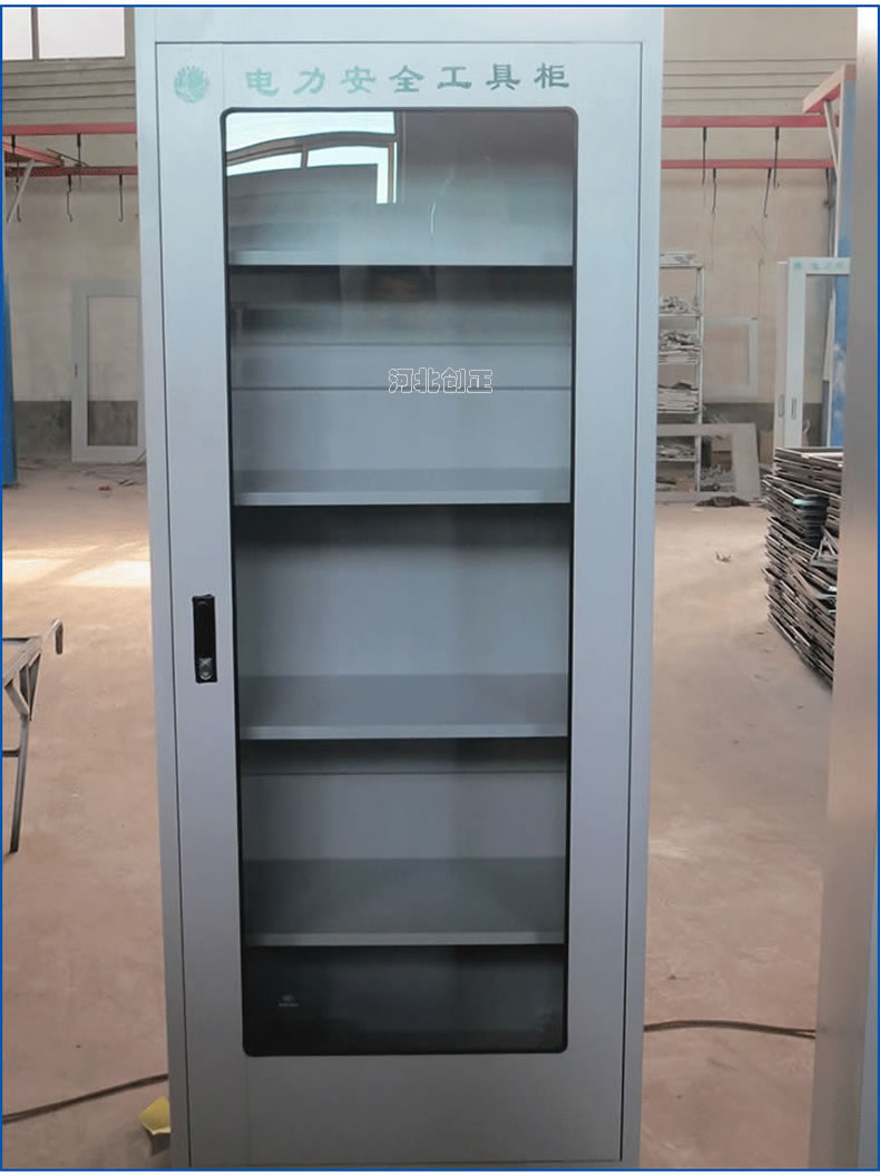 1、柜體是冷軋鋼板卷壓成型,厚度有1.0mm,1.2mm,1.5mm供選擇。柜體表面采用靜電防腐噴塑工藝,顏色為駝灰色,柜門裝有通體透明鋼化玻璃,透過(guò)玻璃可以看到分類有序的工器具。