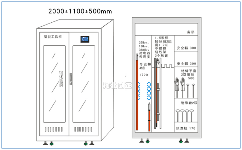 2、智能型安全工具柜裝有溫濕度顯示表和控制操作面板,顯示溫濕度和設(shè)備運行狀態(tài)。柜底可選擇安裝萬向輪和定位螺桿;柜頂可選擇安裝吊杯,方便運輸。應(yīng)用于不同溫濕度地區(qū)的不同電壓等級的變電站、集控站、線路工區(qū)以及電力公司等單位。